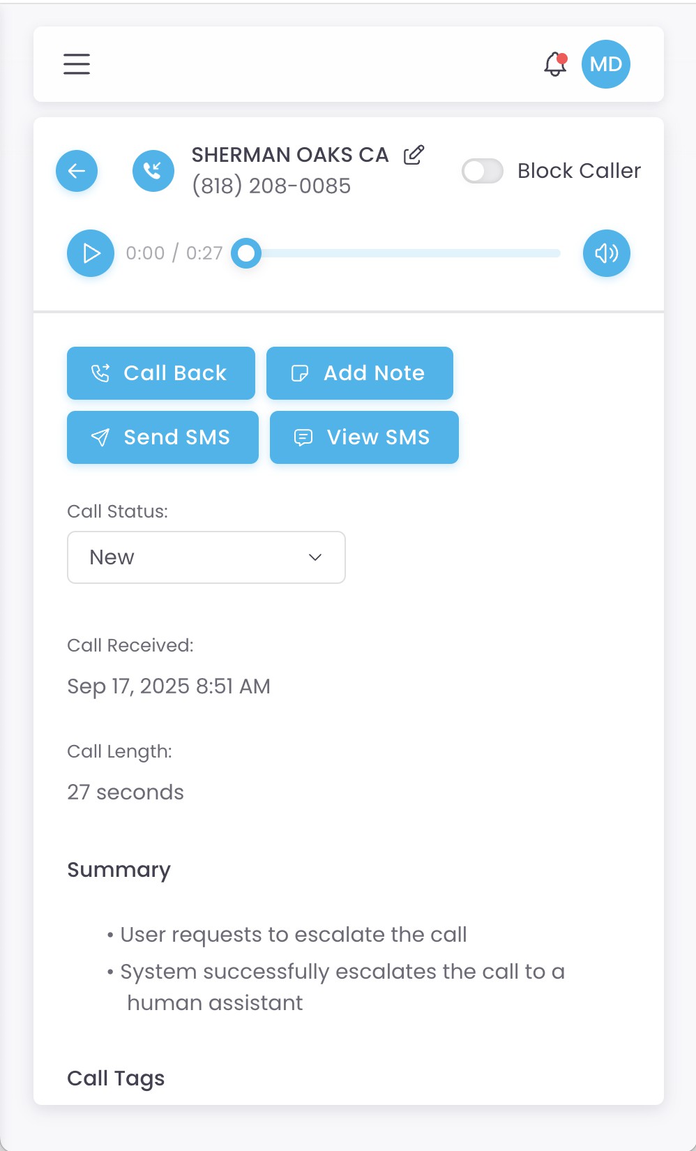 Every call is recorded, transcribed, and analyzed for sentiment and key topics. And if someone hangs up abruptly? The AI automatically sends an SMS follow-up to re-engage and ensure nothing falls through the cracks.